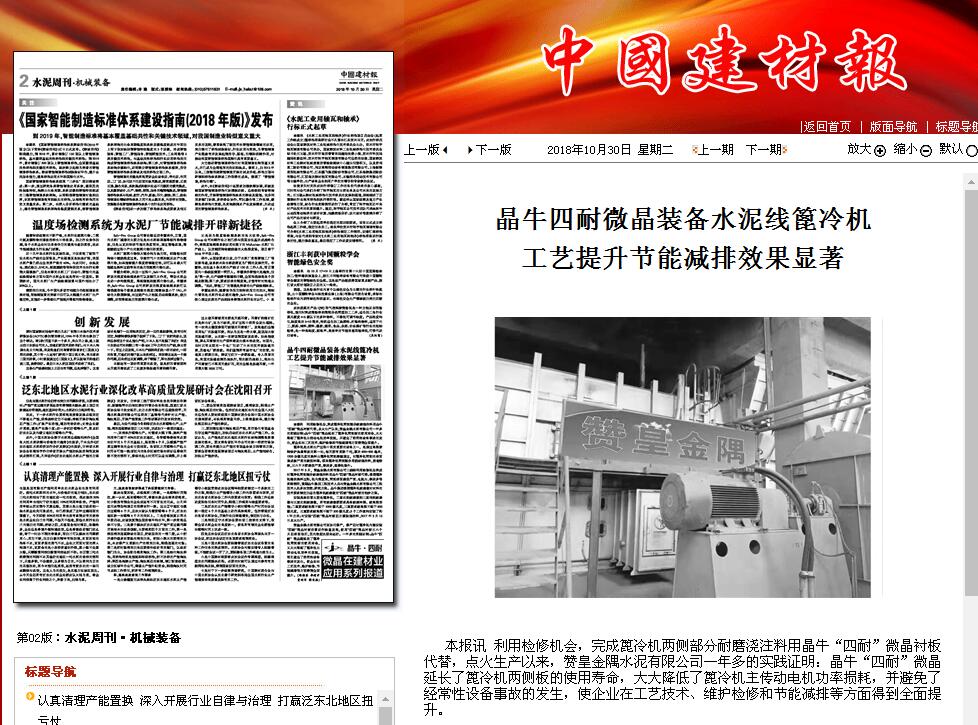 本報訊 利用檢修機(jī)會,完成篦冷機(jī)兩側(cè)部分耐磨澆注料用晶牛“四耐”微晶襯板代替,點火生產(chǎn)以來,贊皇金隅水泥有限公司一年多的實踐證明:晶牛“四耐”微晶延長了篦冷機(jī)兩側(cè)板的使用壽命,大大降低了篦冷機(jī)主傳動電機(jī)功率損耗,并避免了經(jīng)常性設(shè)備事故的發(fā)生,使企業(yè)在工藝技術(shù)、維護(hù)檢修和節(jié)能減排等方面得到全面提升。