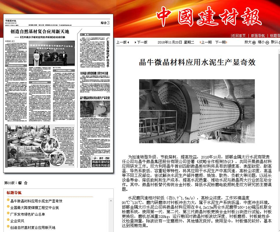 為加速轉型升級、節能降耗、提高效益,2016年10月,邯鄲金隅太行水泥有限責任公司與晶牛微晶集團股份有限公司簽署《戰略合作框架協議》,共同開展微晶材料應用研發工作。雙方利用晶牛研發的四耐微晶新材料所具有的硬度高、表面致密、耐高溫、導熱系數低、容重輕等特性,將其應用于水泥生產中高風速、高粉塵濃度、高溫等不同工況部位,嘗試解決水泥生產部件磨損、燒蝕、散熱、負載大等問題,以延長設備壽命、降低能耗和生產成本、提高水泥質量、推動水泥與微晶兩大行業的互動合作。其中,微晶襯板替代傳統合金襯板、降低水泥粉磨電能損耗是雙方研究的主要課題。