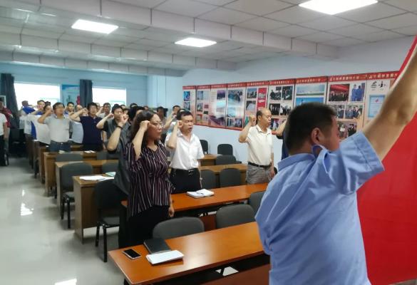 集團黨委委員、副總經理王宏君帶領全體黨員重溫入黨誓詞。大家在鮮紅的黨旗前,舉起右拳,莊嚴宣誓,重溫入黨時的理想與決心。錚錚誓言代表著共產黨員的責任與義務,昭示著身為共產黨員的自豪與驕傲。莊嚴肅穆的會場、洪亮整齊的聲音,讓每位與會黨員干部感受到震撼的同時也接受到心靈的凈化與洗禮。