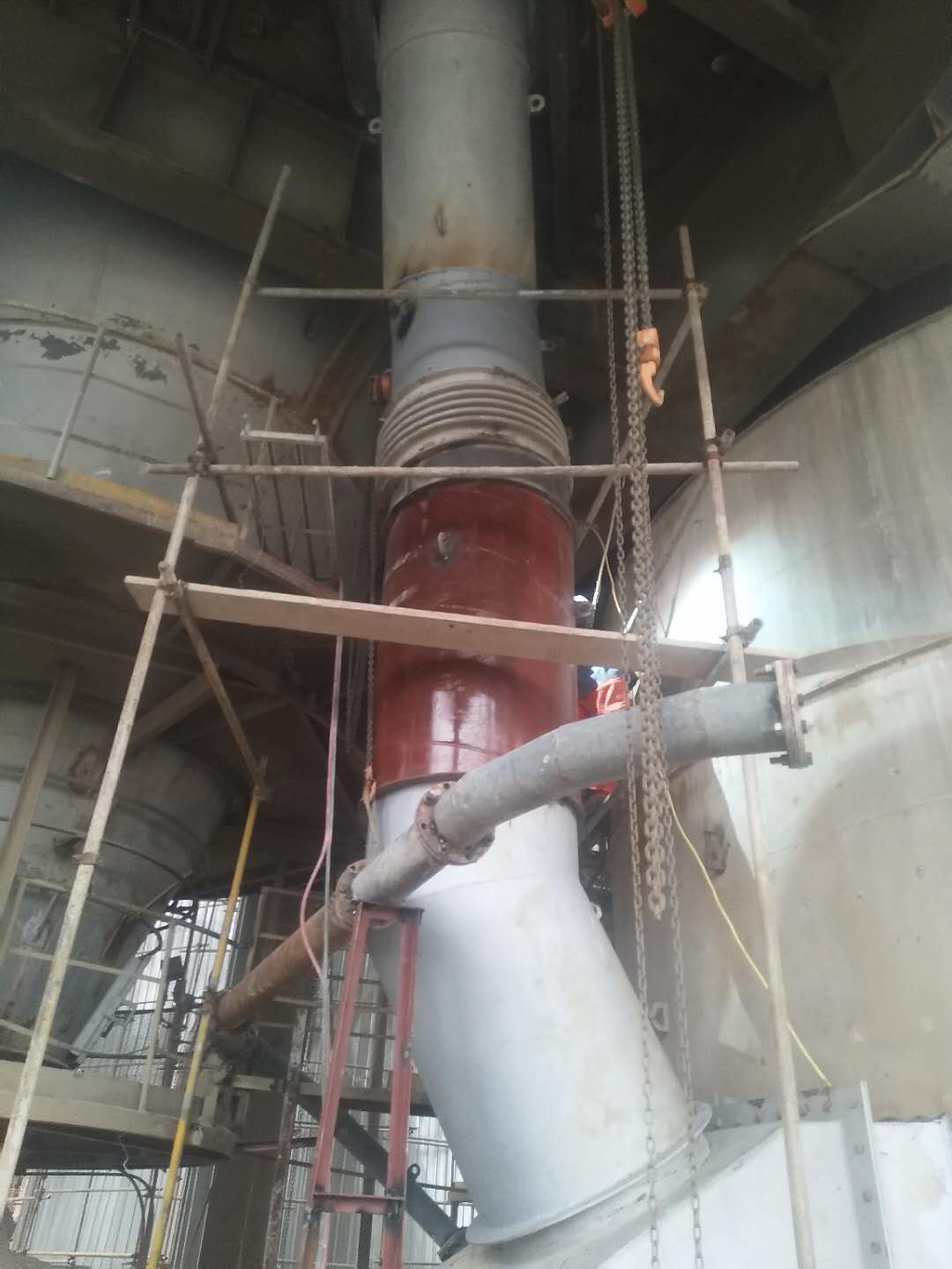 多年來,水泥預熱器下料管內襯大多采用耐磨澆注料。耐磨澆注料壁厚100mm~150mm,密實度小、表面粗糙,極易出現結皮、掛料及堵料現象。下料管內襯要長時間經受1000℃-1200℃以上高溫氣體及高溫物料的沖刷,并且高溫運行工況使水泥下料管內壁起皮結層造成堵料,嚴重影響了水泥窯系統的熱工穩定,對產品質量也造成了一定影響。而且,一線操作人員需采取每20分鐘一次放炮崩渣,或者用水槍擊渣,每班還需多次人工持鏟清理結皮,嚴重時會出現全線停窯處理堵塞事故,對企業效益造成了極大影響。人工清理結皮的方式,屬于高溫、高危作業,人工清理頻繁,每班清理三四次,不但勞動強度大、操作繁瑣,而且極易發生員工燒燙傷事故。
